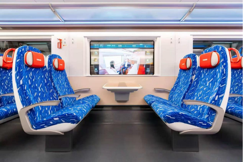 列車在智能服務(wù)、智能監(jiān)控及智能運(yùn)維等方面進(jìn)行了全面升級(jí),車廂座席的小桌板具備無線充電功能,車廂中部安裝有兩塊智慧車窗,旅客不僅可以根據(jù)需求觀看展示視頻,還可以通過點(diǎn)擊“車窗切換”按鈕,自由控制車窗進(jìn)光模式,沉浸式享受更融洽的人機(jī)交互體驗(yàn)。車門上方新增了電子地圖,能夠?qū)崟r(shí)顯示各站位置及到站信息。